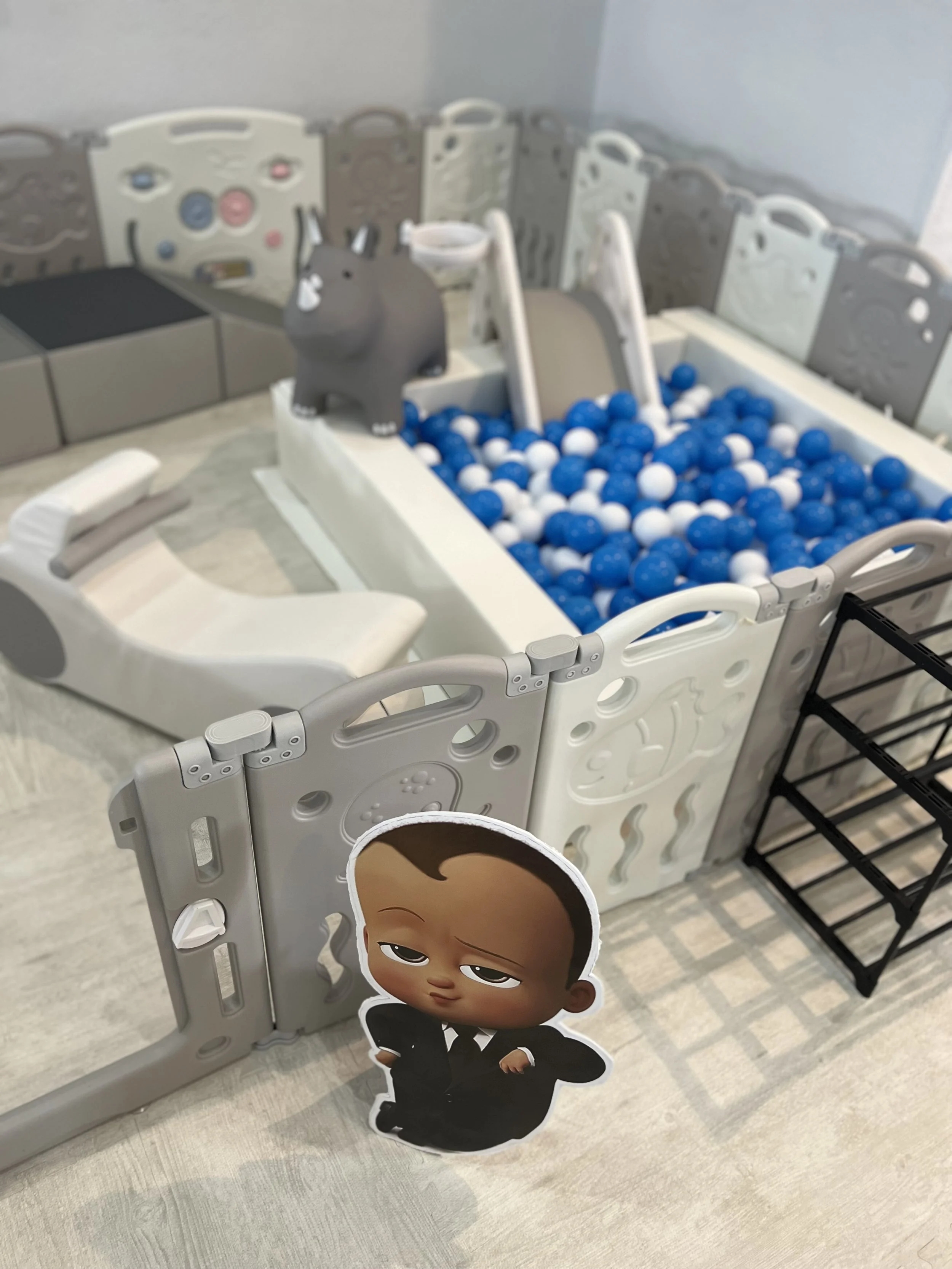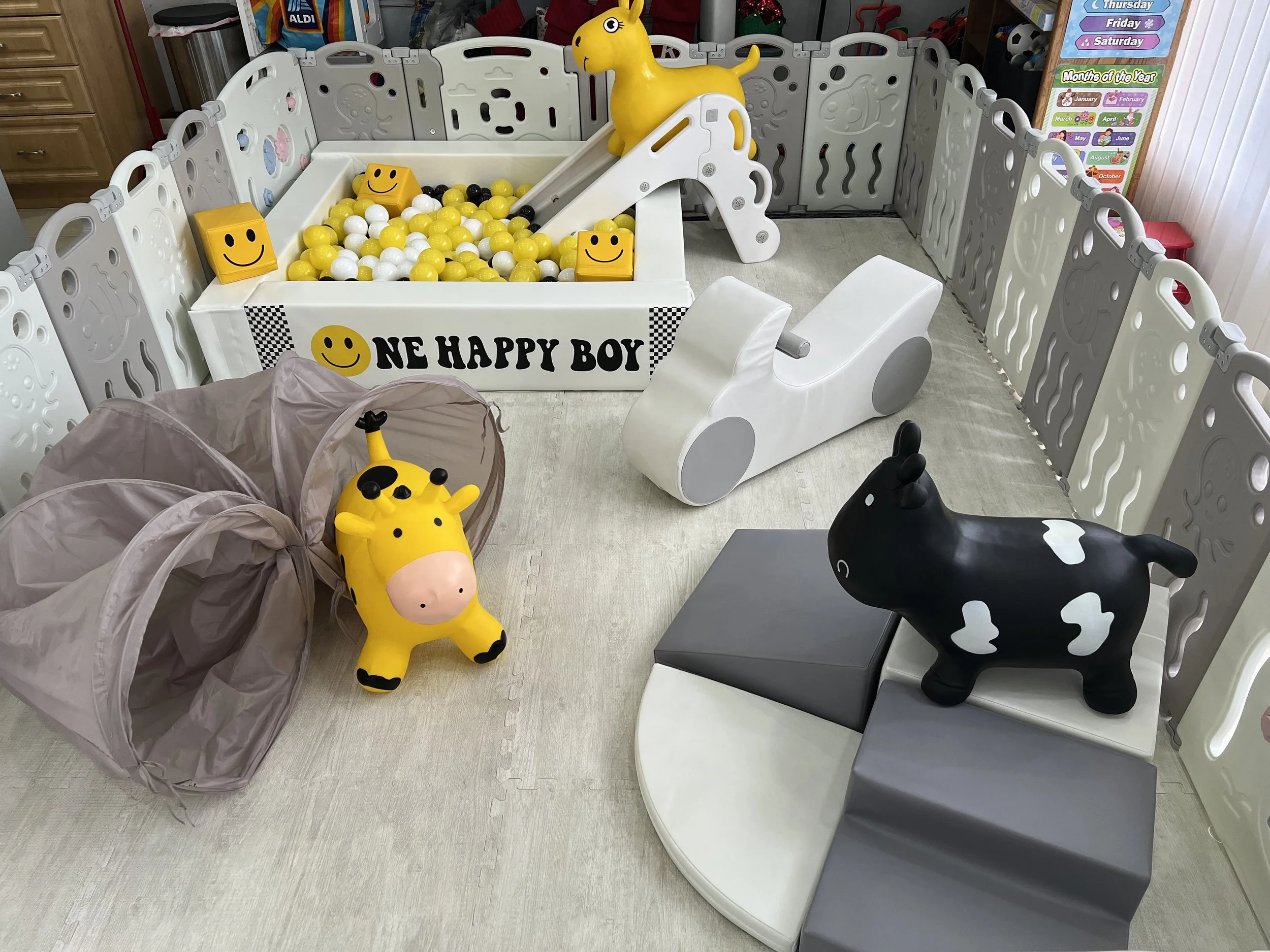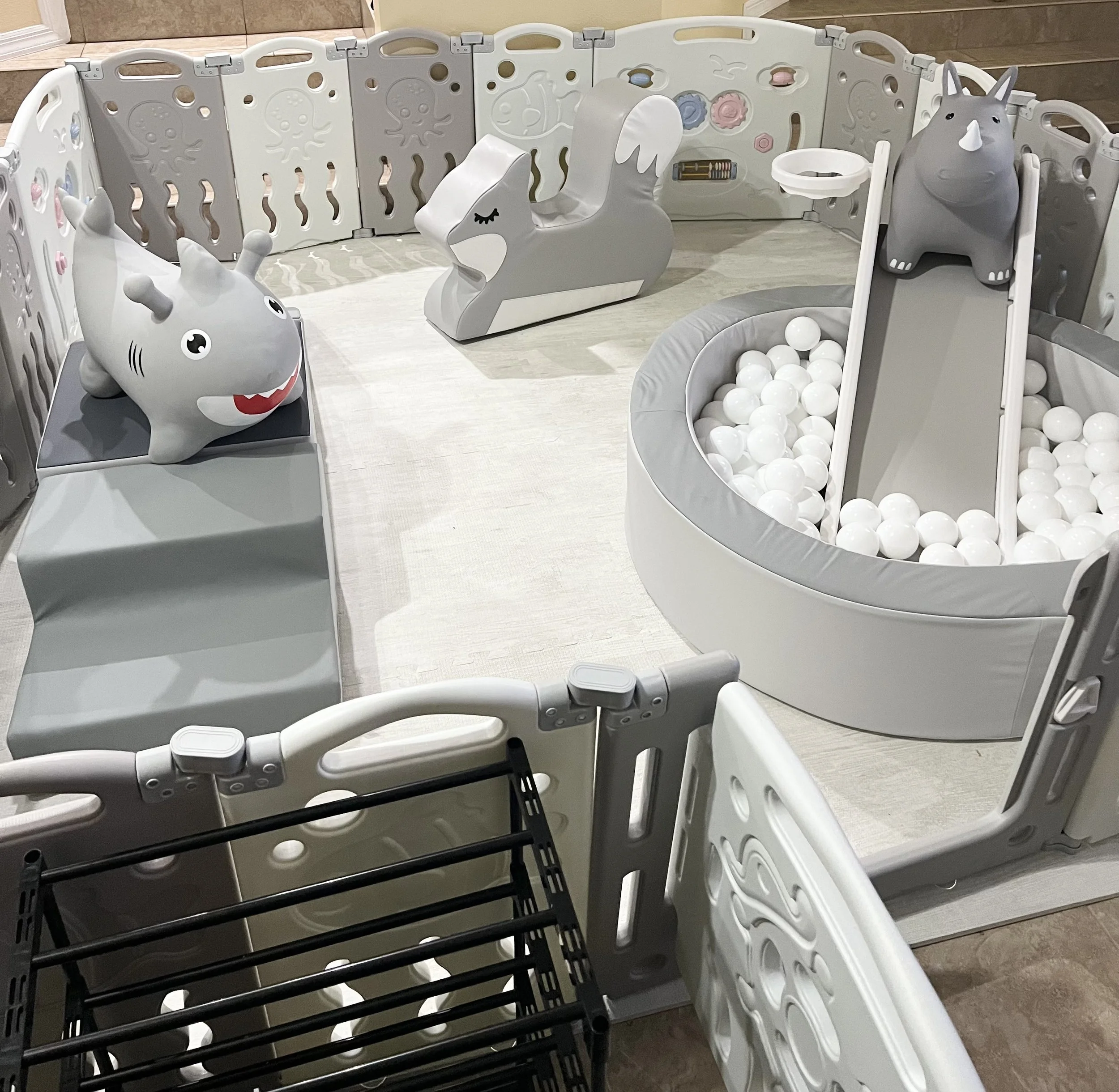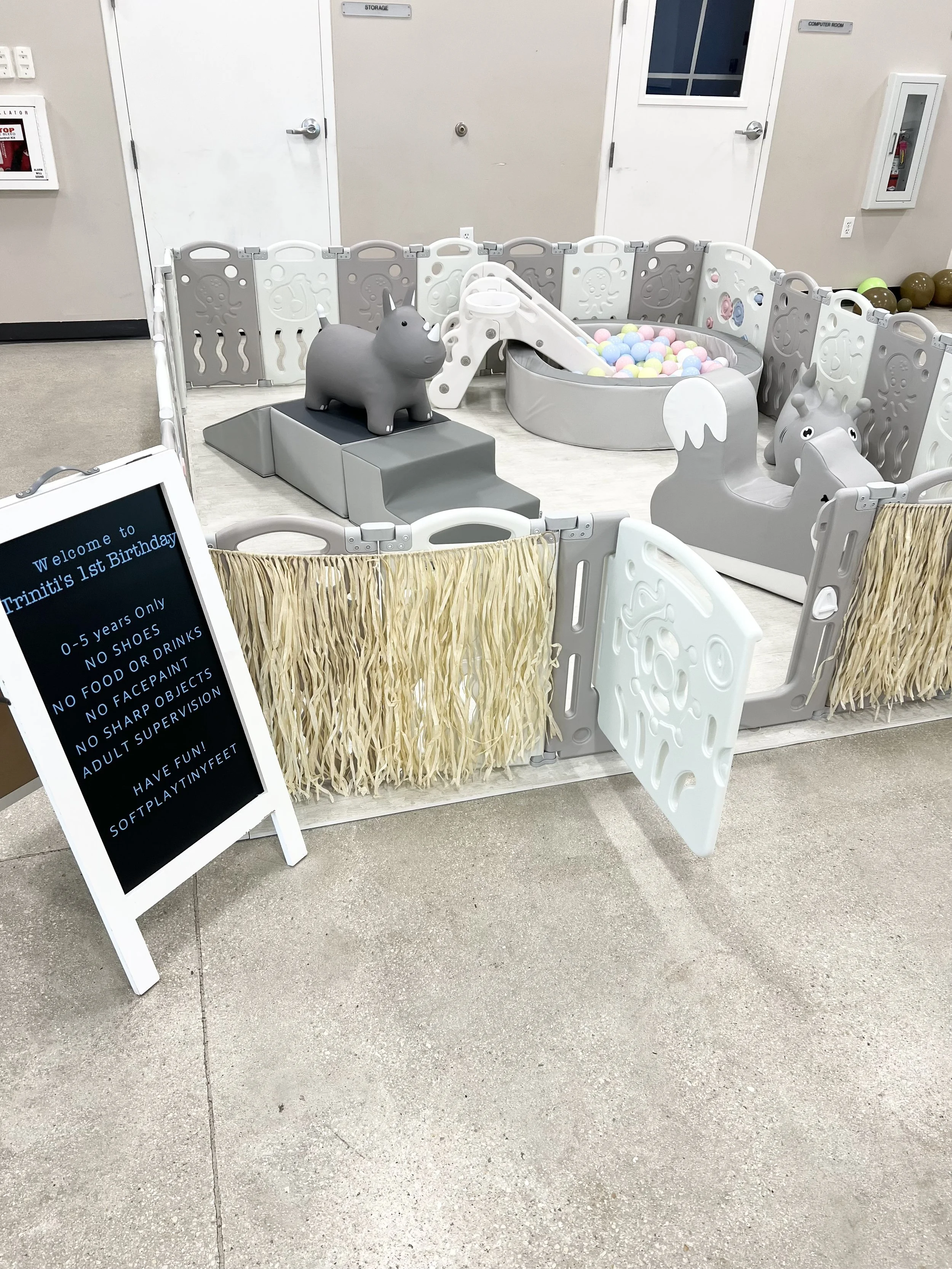 For safety and organization, we provide a shoe organizer, sanitation station (i.e., hand sanitizer, Lysol wipes), and Rules board outside of the play space.